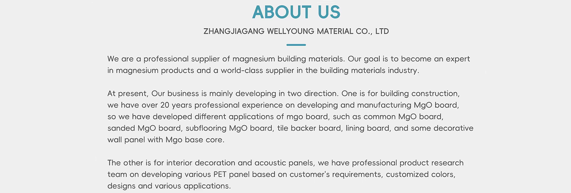 Principais produtos:Placa de óxido de magnésio, placa de MgO de subpiso, placa de MgO leve, placa traseira de telha, painel acústico de ripas de madeira